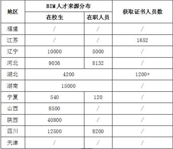1、來源分布。11個省市提供的數(shù)據(jù)表明,BIM人才主要來源于在校學(xué)生,以及接受BIM相關(guān)培訓(xùn)的企業(yè)在崗人員,詳見表所示。